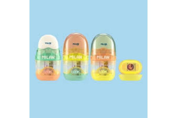 Combinación de goma de borrar y sacapuntas con depósito medida estándar. Diseño CAPSULE, serie New Look. El sacapuntas dispone de una cuchilla de acero afilada y resistente, ideal para todo tipo de lápices